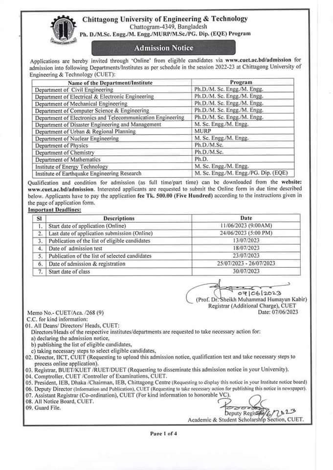 CUET MSc Admission Circular 2023