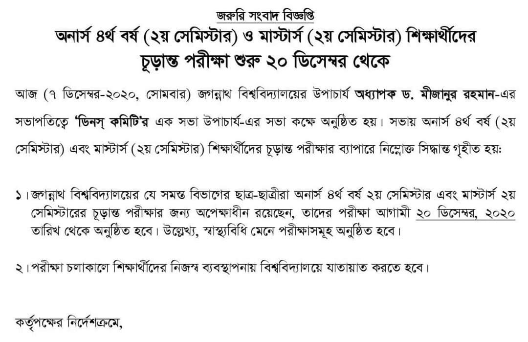 সভায় সিদ্ধান্ত হয়, জগন্নাথ বিশ্ববিদ্যালয়ের যেসব বিভাগের শিক্ষার্থীদের স্নাতক চতুর্থ বর্ষের দ্বিতীয় সেমিস্টার এবং স্নাতকোত্তর দ্বিতীয় সেমিস্টারের চূড়ান্ত পরীক্ষার জন্য অপেক্ষায় রয়েছেন, তাঁদের পরীক্ষা ২০ ডিসেম্বর অনুষ্ঠিত হবে।