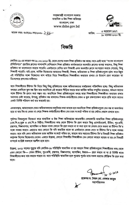 বিজ্ঞপ্তিতে বলা হয়েছে, মাধ্যমিক ও উচ্চ শিক্ষা অধিদপ্তরের আওতাধীন বেসরকারি মাধ্যমিক শিক্ষা প্রতিষ্ঠানসমূহ(এম,পি,ও ভুক্ত ও এম,পি,ও বিহীন) শিক্ষার্থীদের কাছ থেকে টিউশন ফি গ্রহণ করবে।