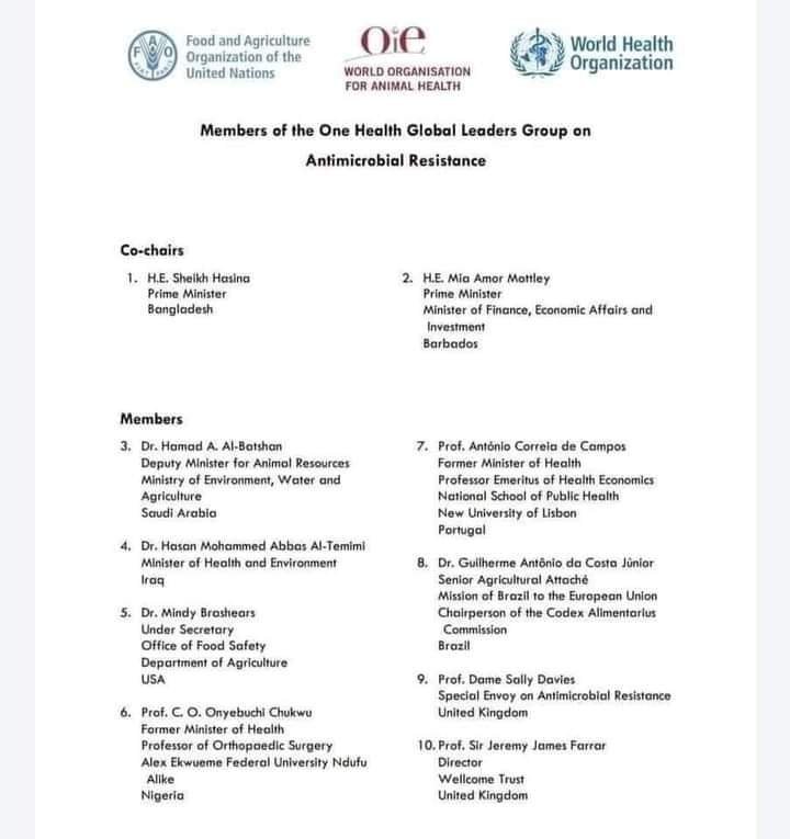 ‘ওয়ান হেলথ গ্লোবাল লিডার্স গ্রুপ অন অ্যান্টিমাইক্রোবিয়াল রেজিসট্যান্স’ এর নব-নির্বাচিত কো-চেয়ার হিসেবে দায়িত্ব পালন করবেন আমাদের মাননীয় প্রধানমন্ত্রী শেখ হাসিনা।